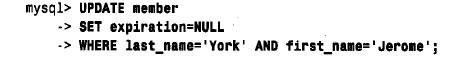 還可以通過設置某列的值為null(假設此列允許null 值)“不設置”此列。如果在未來的某個時候jerome 決定支付成為終生會員的會員資格更新費,那么可以設置其記錄的終止日期為null(“永久”)以標記他為終生會員。具體設置如下:
