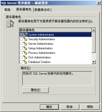 在對話框頂部選擇 server roles 選項卡,以提供對服務器權限的訪問信息,這里突出顯示的角色是 sysadmins(系統管理員),它相當于 mysql 中的根訪問。