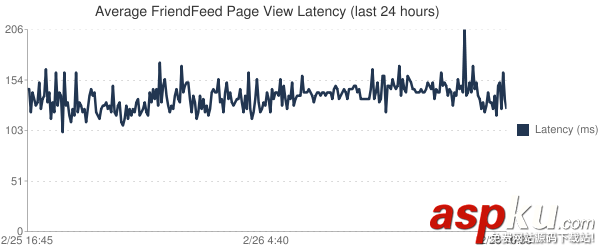 特別地,系統的延時現在也很穩定(哪怕是在午高峰期間)。如下是過去24小時FriendFeed頁面加載延時圖。