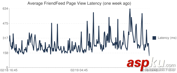 我們對新系統的主索引進行了優化,對結果也很滿意。以下是上個月 FriendFeed 頁面的加載延時統計圖(我們在前幾天啟動了新的后端,你可以根據延時的顯著回落找到那一天)。