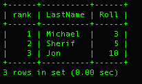 然后我們要根據 Roll_No 字段進行排序并給出排名,我們首先必須定義一個初始值為0的變量,然后在查詢結果中使用這個變量。
