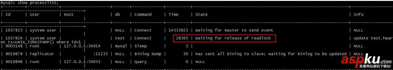 b. 備庫復制hang會導致備份失敗(flush tables with read lock會900s超時)