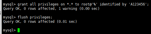 mysql>grant all privileges on *.* to root@'%' identified by 'A123456';