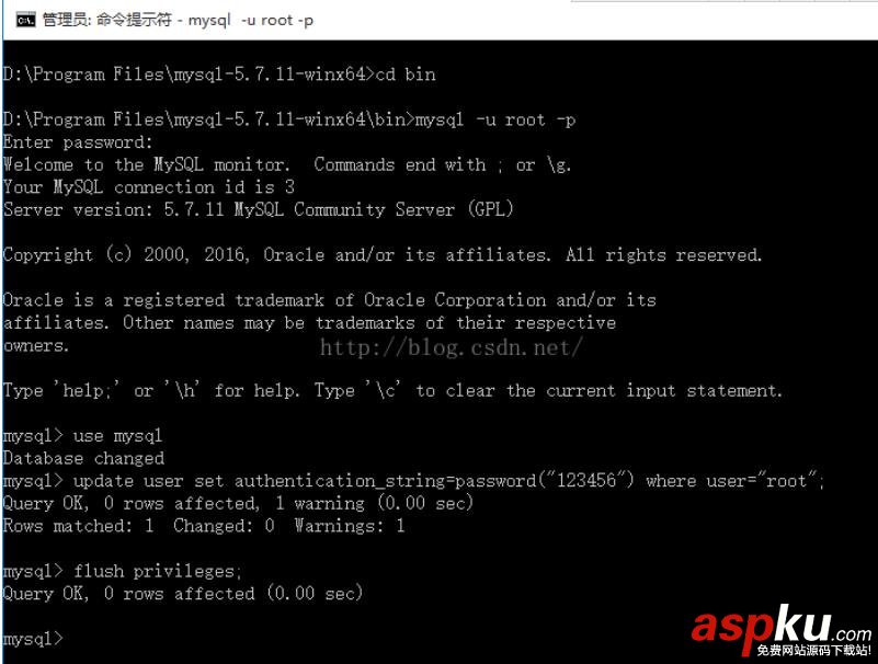 (5.7.11)update user set authentication_string=password("123456") where user="root";