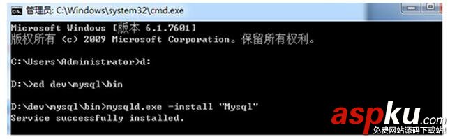 我的習(xí)慣是下載完之后首先注冊系統(tǒng)服務(wù)。CMD打開命令提示符,進(jìn)入到D:/Dev/Mysql/bin 下,把MySql安裝為服務(wù):