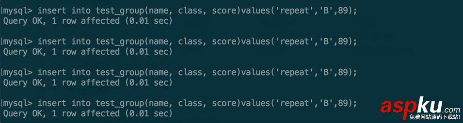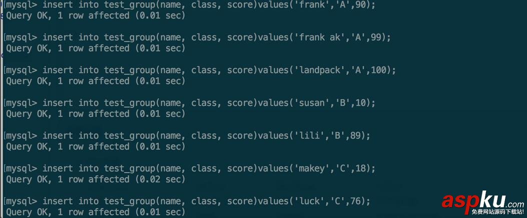 create table test_group(id int auto_increment primary key, name varchar(32), class varchar(32), score int);