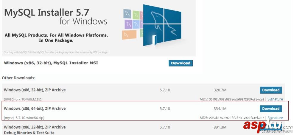 好了,到這里就能下載mysql-5.7.10-winx64.zip版本的安裝包了。上面是32bit的,圖片中標記的是64bit的,大家可以根據自己的實際情況選擇下載。