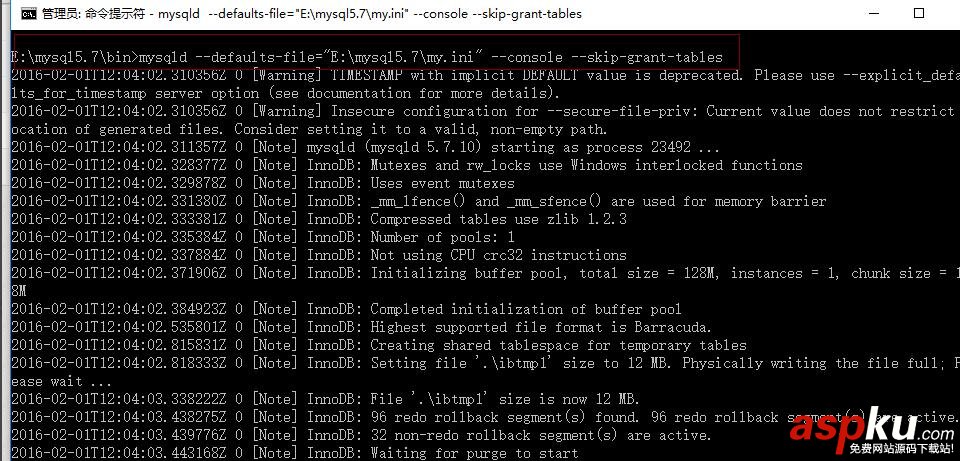在提示命令管理工具輸入如下命令,進入安全模式:mysqld --defaults-file="E:/mysql5.7/my.ini" --console --skip-grant-tables,這里的路徑需要根據你安裝的實際路徑修改。好的,這個窗口我們讓它就這么運行,然后重新打開一個命令提示窗口,記得一定是管理員權限。