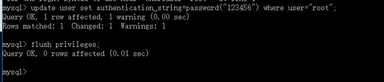 2.給root用戶設置新密碼mysql> update user set authentication_string=password("新密碼") where user="root";Query OK,1 rows affected(0.01 sec)Rows matched:1 Changed:1Warnings: 0