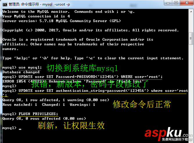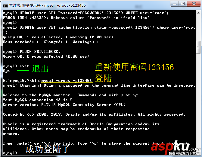 use mysql;UPDATE user SET authentication_string=password('123456') where user='root';FLUSH PRIVILEGES;如下圖: