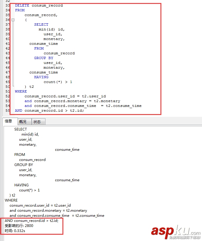 (SELECT min(id) id, user_id, monetary, consume_time FROM consum_record GROUP BY user_id, monetary, consume_time HAVING count(*) > 1 ) t2 查詢出重復記錄形成一個集合(臨時表t2),集合里是每種重復記錄的最小ID