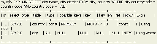 這里查詢是基于兩個表連接。EXPLAIN關鍵字描述了MySQL是如何處理連接這兩個表。必須清楚的是,當前設計要求MySQL處理的是country表中的一條記錄以及city表中的整個4019條記錄。這就意味著,還可使用其他的優化技巧改進其查詢方法。例如,給city表添加如下索引(列表D):