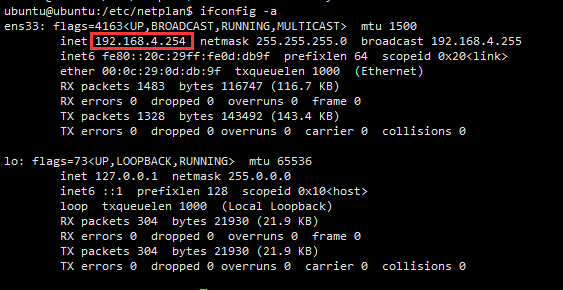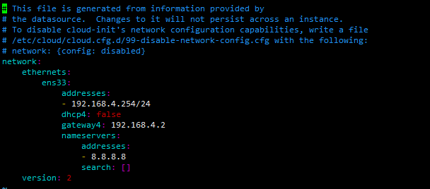 network: ethernets: ens33: addresses: - 192.168.4.254/24 dhcp4: false gateway4: 192.168.4.2 nameservers: addresses: - 8.8.8.8 search: [] version: 2