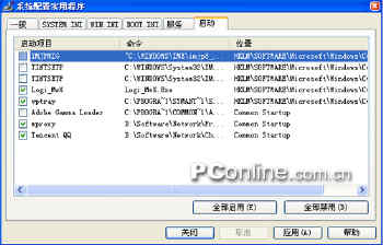 在安裝了QQ,Yahoo! 雅虎通等程序之后,系統啟動的時候就會自動彈出各自程序的頁面,你想不想把他們的自動運行給禁止掉?系統中所有隨機啟動的項目都在圖4所示的頁面中列了出來,現在你可以自己決定哪些程序要自動啟動,哪些程序不用自動啟動了。