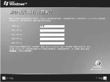 這一次的重啟是真正運行Windows XP了。不過第一次運行Windows XP時還會要求你設置Internet和用戶,并進行軟件激活。Windows XP至少需要設置一個用戶賬戶,你可在“誰會使用這臺計算機”步驟(圖9)中輸入用戶名稱就行了,中文英文均可。