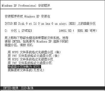 接著會顯示硬盤中的現有分區或尚未劃分的空間(圖3),在這里要用上下光標鍵選擇Windows XP將要使用的分區,選定后按回車鍵就行了。