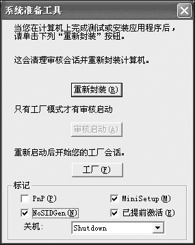 設置完成之后,點擊上部的“重新封裝”按鈕,這時Windows系統自動進行重新封裝操作,完成之后會自動關閉計算機。這時候原先安裝Windows XP的分區就是一個干凈的封裝系統盤了,最后可以通過軟盤或者光盤引導計算機進入DOS模式,借助Ghost對其進行克隆鏡像之后刻錄為光盤保存,這樣就能夠用它在其它計算機上快捷安裝Windows XP了。