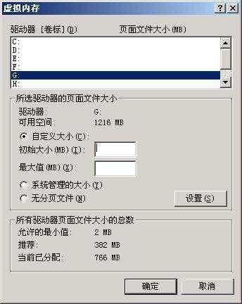 ③在該對話框中可看到關(guān)于虛擬內(nèi)存的區(qū)域,點(diǎn)擊“更改”按鈕進(jìn)入“虛擬內(nèi)存”的設(shè)置窗口。選擇一個有較大空閑容量的分區(qū),勾選“自定義大小”前的復(fù)選框,將具體數(shù)值填入“初始大小”、“最大值”欄中,而后依次點(diǎn)擊“設(shè)置→確定”按鈕即可(圖2),最后重新啟動計(jì)算機(jī)使虛擬內(nèi)存設(shè)置生效。