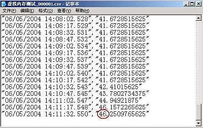 接下來運(yùn)行自己常用的一些應(yīng)用程序,運(yùn)行一段時間后,進(jìn)入日志文件所在的系統(tǒng)分區(qū)下默認(rèn)目錄“PerfLogs”,找到“虛擬內(nèi)存測試_000001.csv”并用記事本程序打開它(圖6),在該內(nèi)容中,我們查看每一欄中倒數(shù)第二項(xiàng)數(shù)值,這個數(shù)值是虛擬內(nèi)存的使用比率,找到這項(xiàng)數(shù)值的最大值,比如圖中的“46”,用46%乘以500MB(前面所設(shè)定的虛擬內(nèi)存數(shù)值),得出數(shù)值為230MB。