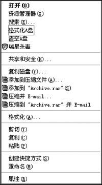 經(jīng)過上述的設(shè)置,現(xiàn)在我們在“我的電腦”或“資源管理器”窗口中,右鍵單擊A盤盤符,在彈出的快捷菜單中就會有一個如圖3所示的“格式化A盤”的命令選項,單擊該命令即可對A盤進(jìn)行格式化操作。