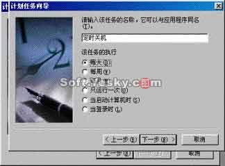 現在某些主板上已經集成了定時關機功能,如果你的主板沒有此功能,也可以在Win 2000中實現。首先當然要求主板必須支持軟件關機功能,否則你還得親自去按電源開關才能關機,現在的主板一般都支持軟件關機。操作步驟:單擊“開始”/程序/附件/系統工具中"計劃任務",彈出計劃任務窗口,然后雙擊"添加已計劃的任務",運行“計劃任務向導”,按“瀏覽”(如圖2),找到WINDOWS目錄中的Rundll32.exe 文件,單擊"打開"按鈕,在出現的對話框中鍵入該任務的名字(如"定時關機"),執行方式選擇“每天”(如圖3) ,然后按“下一步”選擇定時關機時間(可以先試一下比現在機器上顯示的時間晚1分鐘),下一步選中“當單擊完成打開該任務的高級屬性”,單擊"完成",最后右擊"定時關機"來打開屬性,在運行欄輸入“C:/WINDOWS/RUNDLL32.EXE USER.EXE,EXITWINDOWS”,單擊"確定"不久,就會看到機器自動關機了。