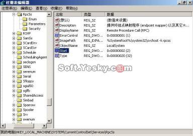運行Regedit,在HKEY_LOCAL_MACHINE/SYSTEM/CurrentControlSet/Services分支,找到RpCSS子目錄,修改其中的項值Start,把4改為2(即恢復原啟動類型“自動”,如圖8),項值Start取值意義是: