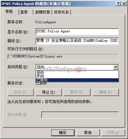 例如要禁止ipSEC Policy Agent”服務,可以選擇“設置”/控制面板/管理工具/服務,進入服務管理器,雙擊“IPSEC Policy Agent”服務,彈出該服務屬性窗口(如圖7),選“已禁用”,然后按“應用”、“確定”退出,重新啟動后,該項服務就被禁用;或按“停止”按鈕,暫時禁用該服務。