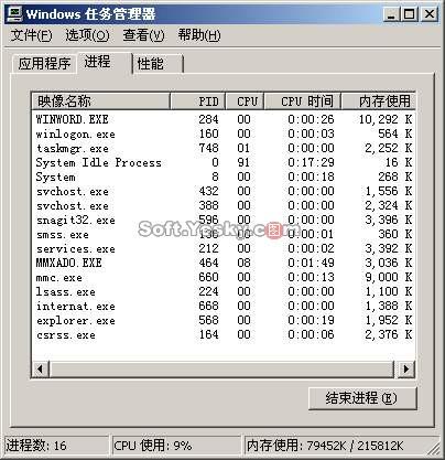 按CTRL+ALT+DEL,單擊任務管理器,可以看見正在運行的進程(如圖9),隨時檢查進程,可及時發現黑客和病毒程序,按“結束進程”按鈕,能中止進程的運行;當應用程序因“發瘋”而失去控制時,也可以用此法退出該程序。