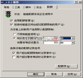 NTFS分區除了可以加密其上的文件夾和文件外,還支持磁盤配額限量功能,非NTFS分區不支持該功能。啟用磁盤配額時,您可以設置磁盤配額限度和配額警告級別,指定允許用戶使用的磁盤空間容量,當用戶接近配額限度則發出警告、記錄下來。例如,可設置用戶的磁盤配額限度為 500 MB,警告級別為 450MB。如果用戶在卷上存儲的文件超過 450 MB,則會記錄下該配額警告,而且不能存放超過500MB的文件。要為某用戶指定NTFS分區磁盤配額,方法是:以管理員身份登陸Win 2000,打開“我的電腦”,右擊NTFS分區(一般為C盤),在屬性窗口選擇“配額”,進入配額設置窗口(如圖10),選中“啟用配額管理”和“拒絕將磁盤空間給超過配額限制的用戶”,設置磁盤空間限制量(例如500MB)和超過多少空間警告(例如450MB),選中“用戶超過配額限制時記錄事件”,這樣以后按“配額項”按鈕,就可以查看該用戶是否有超過配額的操作。