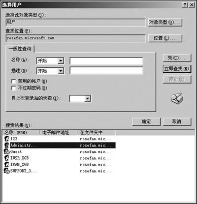 第5步 如果不知道用戶的確切名稱,可以使用高級查找功能,查找用戶。單擊“選擇用戶”對話框中的“高級”按鈕,顯示“選擇用戶高級選項”對話框。單擊“立即查找”按鈕,即可在“搜索結果”下拉列表框中顯示出當前計算機中存在的所有用戶,如圖5所示。