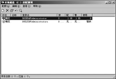 第1步 在“配額”選項卡下,單擊“配額項”按鈕,顯示 “本地磁盤的配額項”窗口。
