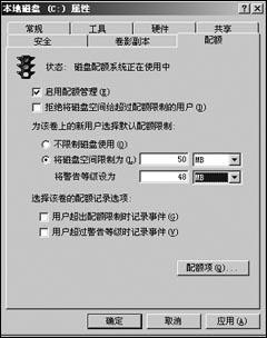 * 磁盤配額只有在NTFS文件系統才支持,以卷為單位管理磁盤配額,必須在NTFS格式的卷上才可以實現該功能。不過,只有Windows 2000/XP/2003操作系統的NTFS文件系統才能支持磁盤配額,不能在Windows NT 4.0的NTFS分區上設置磁盤配額。