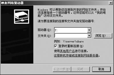 第2步 打開“驅動器”下拉列表,為該連接指派一個驅動器號。在“文件夾”文本框中鍵入遠程計算機的卷路徑,其形式為: