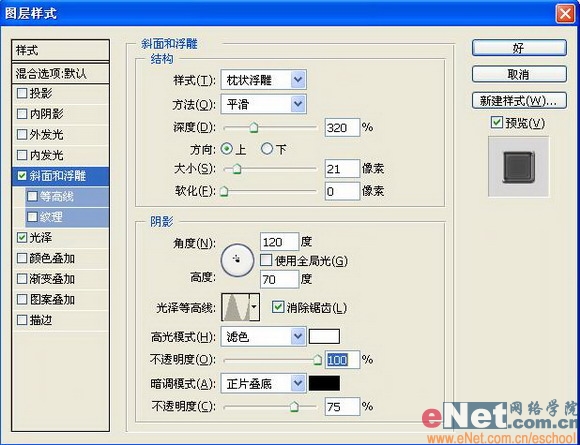 6、單擊圖層面板下方的“添加圖層樣式”按鈕,在彈出的菜單中選擇“斜面和浮雕”命令,在彈出對話框中設置樣式為枕狀浮雕,深度設置為320,大小設置為21,高度設置為70,光澤等高線選擇環形,勾選消除鋸齒選項,將高光模式的不透明度設置為100,如圖07所示,圖像效果如圖08所示。