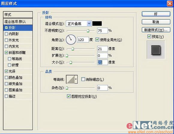 7、單擊圖層面板下方的添加圖層樣式按鈕,在彈出的菜單中選擇“投影”命令,在彈出的對話框中,設置距離為21,大小為21,如圖09所示,文字最終效果如圖10所示。