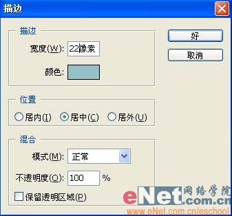 4、保留選區,在圖層面板中新建圖層1,執行菜單欄中的“編輯”“描邊”命令,在彈出的描邊對話框中設置寬度為22,顏色為淡藍色,位置居中,其余默認,如圖03所示,圖像效果如圖04所示。