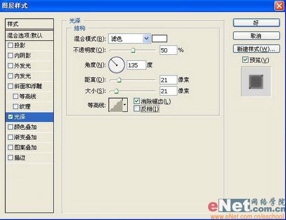 5、單擊圖層面板下方的“添加圖層樣式”按鈕,在彈出的菜單中選擇“光澤”命令,在彈出對話框中設置混合模式為濾色,顏色設置為白色,角度設置為135,距離設置為21,大小設置為21,等高線選擇圓形臺階,勾選消除鋸齒選項,如圖05所示,圖像效果如圖06所示。