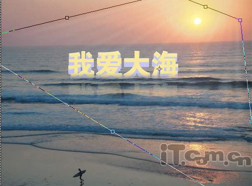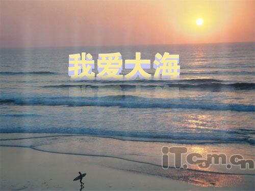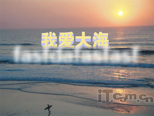 接下來是做點(diǎn)字體的倒影,按剛才的方法,先按住shit鍵,把剛才新建的兩個(gè)圖層和“我愛大海”及“我愛大海副本”四個(gè)圖層合并成一個(gè)圖層,然后復(fù)制這個(gè)圖層,移動(dòng)到相應(yīng)的位置,如下圖:
