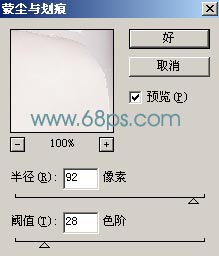 3.新建一個圖層按ctrl + shift + alt + e 蓋印圖層,執行菜單:濾鏡 > 雜色 > 蒙塵與劃痕參數設置如圖3,確定后再執行菜單:濾鏡 > 模糊 > 高斯模糊 數值為6效果如圖4,然后把圖層混合模式改為“柔光”,圖層不透明度改為:60%,效果如圖5,完成最終效果。