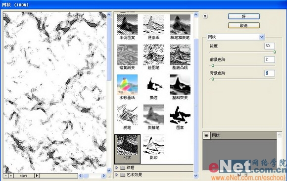 4、執行菜單欄中的“濾鏡”“素描”“網狀”命令,在彈出的網狀對話框中,將濃度選項設置為50,前景色階為2,背景色階為2,如圖04所示,圖像效果如圖05所示。