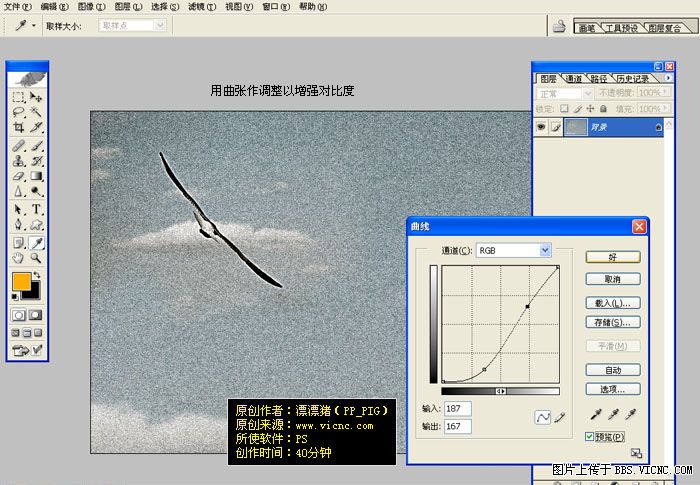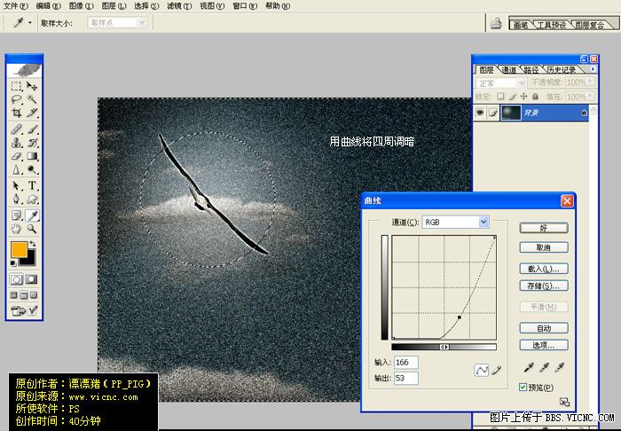 7.用橢圓選框工具把鷹的區域用正圓選取按ctrl + shift + d 羽化數值為45,然后按ctrl + shift + i 反選按ctrl + m 把周圍調暗