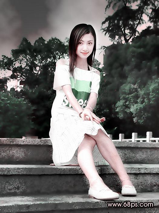 5.新建一個(gè)圖層,按"ctrl + shift + alt + e蓋印圖層,選擇加深工具把背景比較亮的地方加深一點(diǎn),再選擇減淡工具把人物的臉部美白一下效果如圖7