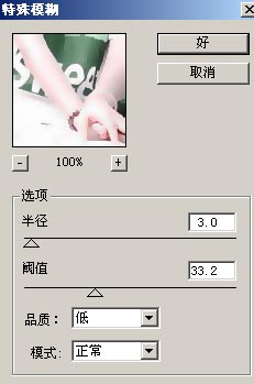 6.按ctrl + j 復(fù)制一層,執(zhí)行菜單:濾鏡 > 模糊 > 特殊模糊 參數(shù)設(shè)置如圖8,加上蒙版使用黑色畫筆把人物部分擦出來(lái)效果如圖9