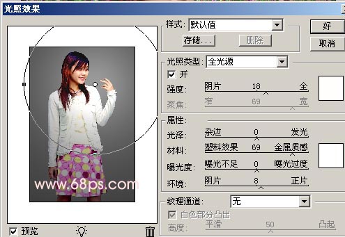 6.對(duì)人物圖層執(zhí)行菜單:濾鏡 > 渲染 > 光照效果 參數(shù)設(shè)置如圖9,確定后再使用topaz濾鏡銳化一下。效果如圖10