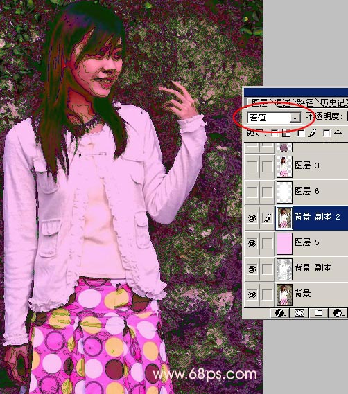3.把背景圖層復(fù)制一份,然后移到最上面的圖層如圖4所示把圖層混合模式改為“差值”,有點(diǎn)效果出來(lái)了,人物比較難看,不過(guò)不要緊張。要與眾不同就是要學(xué)會(huì)從另類的地方出發(fā),這樣才能突破傳統(tǒng)。
