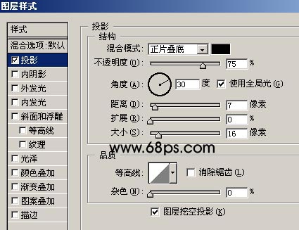 5.再把背景圖層復(fù)制一份移到圖層最上面然后把人物用鋼筆工具勾出來(lái),人物勾出來(lái)后把剛才復(fù)制的背景圖層隱藏,雙擊人物圖層調(diào)出圖層樣式進(jìn)行投影,參數(shù)設(shè)置如圖7,效果如圖8。