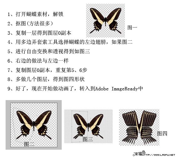 本教程利用簡(jiǎn)單的蝴蝶素材制作翩翩扇動(dòng)翅膀的蝴蝶動(dòng)畫,制作的時(shí)候需要把蝴蝶翅膀勾出來分為左右兩部分,再分別對(duì)每一部分進(jìn)行透視變形,需要注意翅膀變形后不要失真。