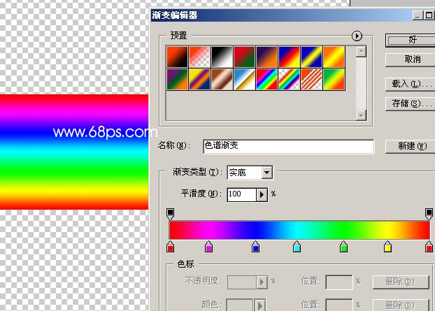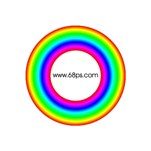 5.下面開始制作彩虹效果,重新新建一個500px * 500px的透明背景文件,用巨型選框工具在中間繪制一個長條矩形選區,使用漸變工具里面有默認的彩虹漸變顏色,然后在選區中繪制漸變
