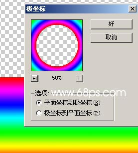6.漸變繪制好以后按ctrl + d取消選區,按ctrl + a 全選,按ctrl + x 煎切,再按ctrl + v 粘貼這樣確保圖形在畫布的正中心,執行菜單:濾鏡 > 扭曲 > 極坐標,參數設置如圖8,效果如圖9,彩虹就做好了。
