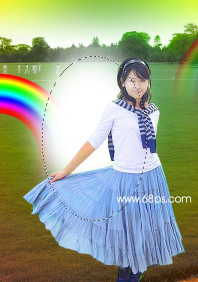 8.在人物的下面新建一個圖層用橢圓選框工具繪制一個橢圓如下圖,按ctrl + shift + d 羽化數值為30,然后填充為白色。